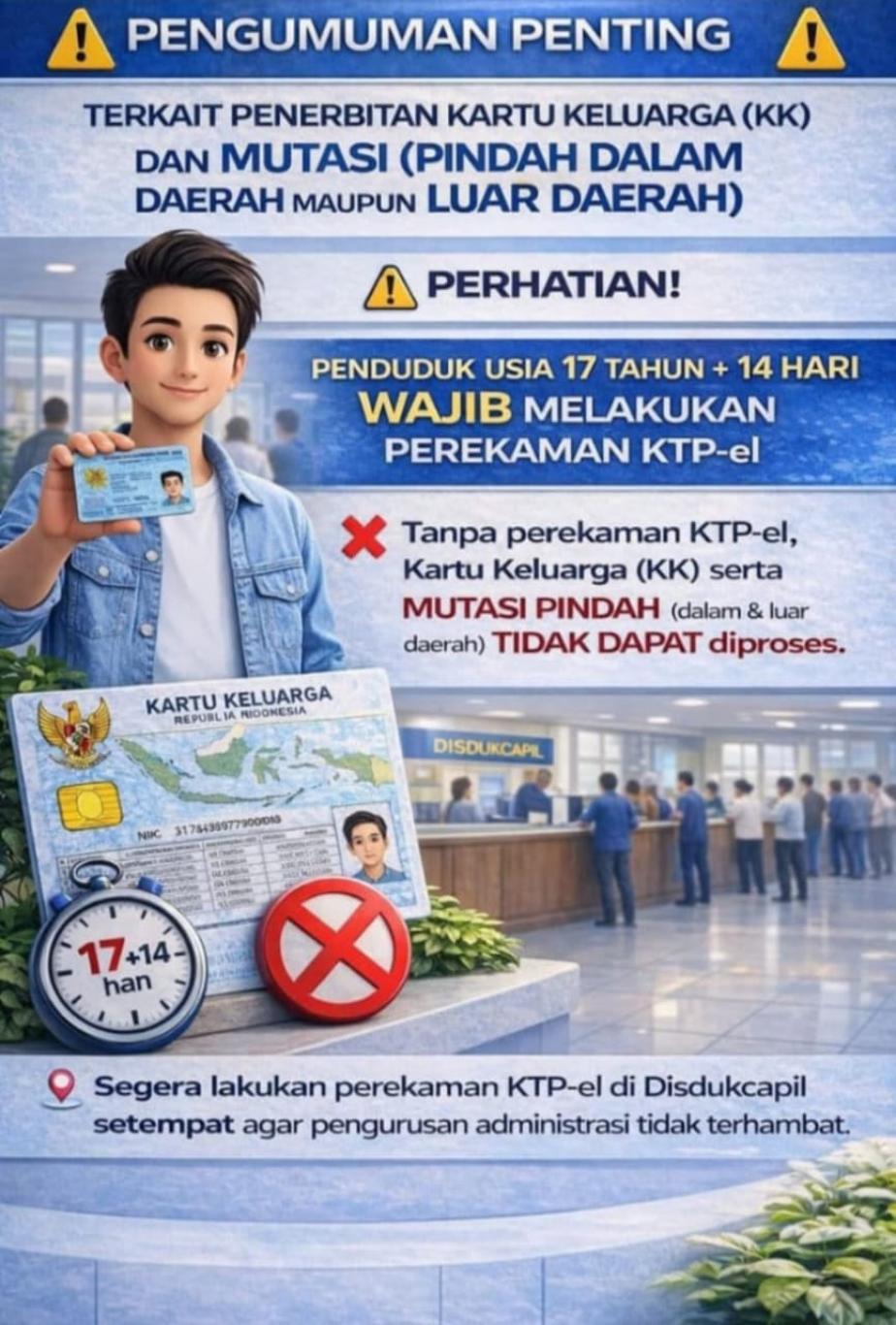 TIGAWASA_ Informasi untuk Masyarakat terkait penerbitan/pencetakan kartu Keluarga, apabila anggota keluarga sudah berusia 17 tahun diwajibkan untuk perekaman KTP-el, jika belum melakukan perekaman makan Kartu keluarga tidak bisa diterbitkan ataupun dicetak, begitu pula dengan mutase pindah tidak bisa diproses